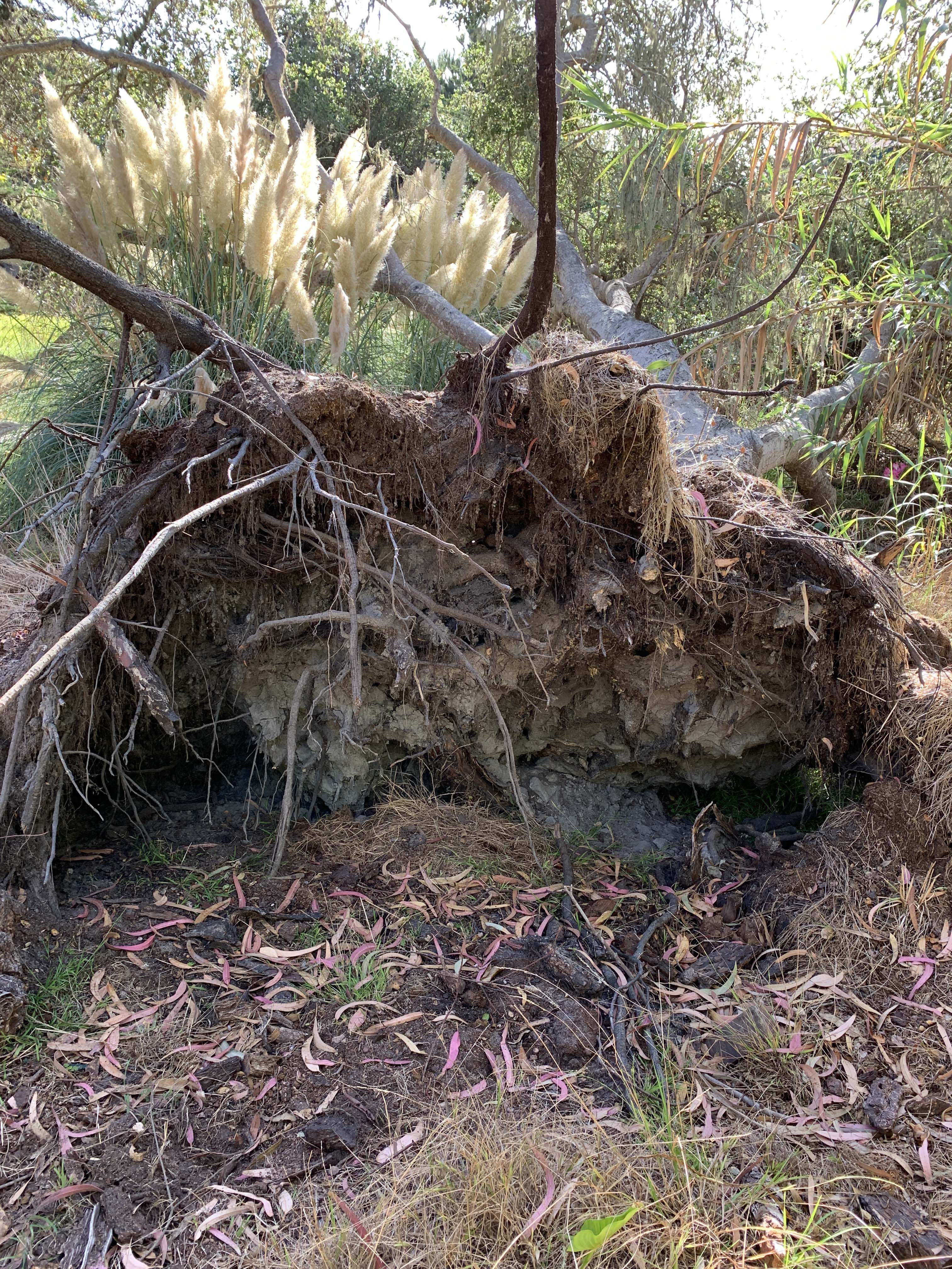 The backyard was a microcosm of coastal forest with barely navigable walking trails. A portion of it looked like Kansas in the Wizard of Oz. One tree crunched an outbuilding, but the house itself was unscathed.